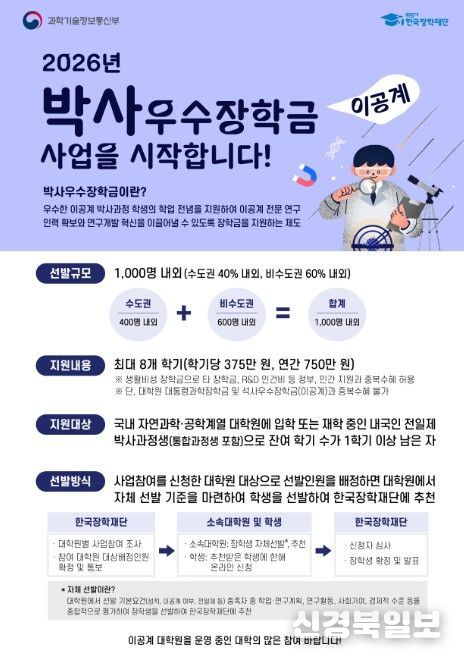 [ 신경북일보 ] 과학기술정보통신부와 한국장학재단은 2026년도 이공계 박사 우수장학금 사업을 올해 처음으로 시행한다고 밝혔다. 이공계 박사 우수장학금은 사업 참여를 신청한 대학원의 소속 학생 중 장학생을 선발하며, 대학원의 사업 참여 신청 기간은 4월 14일부터 4월 20일까지이다.