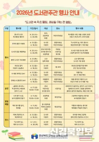 [ 신경북일보 ] 경상북도교육청 청송도서관이 2026년 4월 도서관주간을 맞이하여 ‘도서관 속 작은 펼침, 세상을 여는 큰 열림’을 주제로 다양한 독서·문화 프로그램을 운영한다.