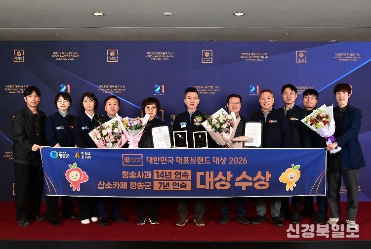 [ 신경북일보 ] 청송군은 14일 열린 ‘2026 대한민국 대표브랜드 대상 시상식’에서 사과 브랜드 부문 '청송사과'가 14년 연속 대상, 도시 브랜드 부문 '산소카페 청송군'이 7년 연속 대상을 수상했다고 밝혔다.