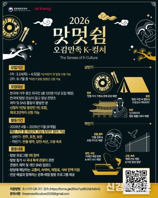 [ 신경북일보 ] 문화체육관광부는 국제방송교류재단과 함께 한국의 다채로운 매력을 세계에 알리는 ‘2026 맛·멋·쉼 오감만족 케이-컬처’ 사업을 추진한다. 이 사업에서 주한 외국인 콘텐츠 창작자(인플루언서) 120여 명은 한국의 맛·멋·쉼을 경험하고 이를 누리소통망(SNS) 콘텐츠로 제작해 세계에 알린다.