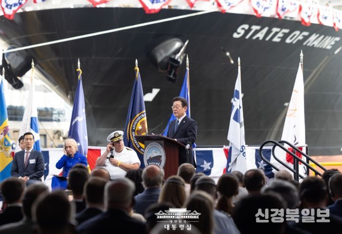 [ 신경북일보 ] 이재명 대통령은 26일(현지시간) 오후 미국 필라델피아에 위치한 한화 필리조선소를 방문해 미국 해양청이 발주한 국가안보다목적선 '스테이트 오브 메인'호의 명명식에 참석했다.