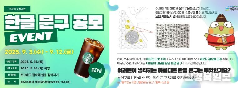 공모 기간은 9월 3일부터 9월 12일까지이며, 수성구청 홈페이지(누리집) 내 ‘토크대구’ 설문조사 알림창을 통해 누구나 참여할 수 있다. 참여자들은 수성구를 대표할 수 있는 한글 문구 3개를 자유롭게 추천할 수 있으며, 추첨을 통해 50명에게 커피 모바일 교환권을 증정한다.