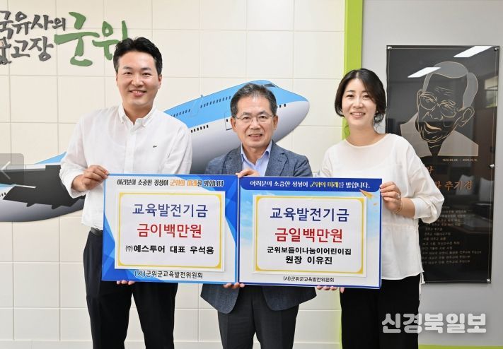 [ 신경북일보 ] (사)군위군교육발전위원회 이사로 활동 중인 ㈜예스투어 우석용 대표와 부인인 군위보듬이나눔이어린이집 이유진 원장이 지난 3일 군위군청을 방문해 지역의 교육 발전과 인재양성을 위해 써달라며 각각 200만 원과 100만 원의 교육발전기금을 기탁했다.