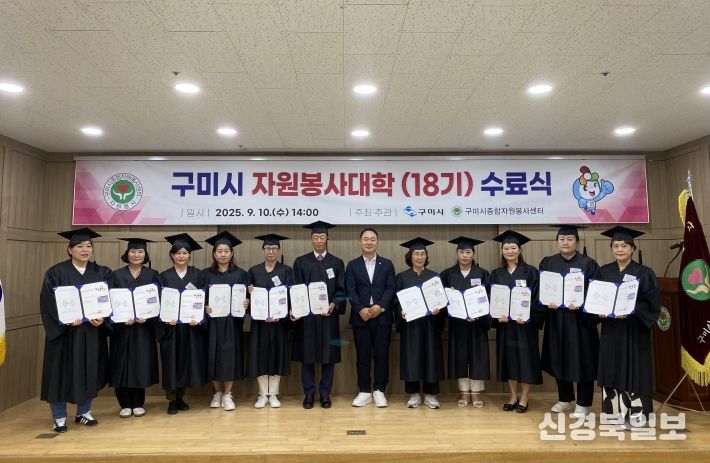 [ 신경북일보 ] 구미시는 지난 10일 구미시종합자원봉사센터(센터장 하준호) 주관으로 자원봉사대학 18기 수료식을 열고, 5개월 간 이어진 교육 과정을 성공적으로 마무리했다. 이번 수료식에서는 47명의 교육생이 수료증을 받았으며, 우수자 시상, 결의문 낭독, 소감 발표 등이 이어졌다.
