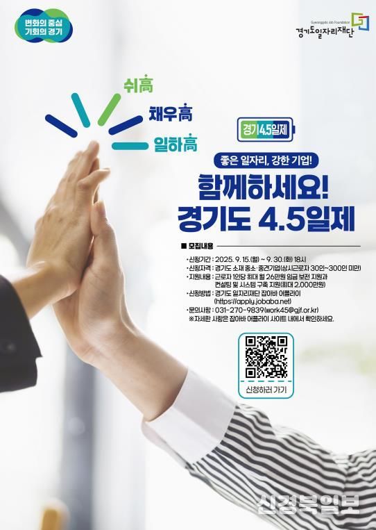 [ 신경북일보 ] 경기도와 경기도일자리재단은 노동자의 일·생활 균형과 노동환경 개선을 통한 생산성 향상을 위해 15일부터 30일까지 ‘2025년 경기도 4.5일제 시범사업’ 참여 기업 3차 추가 모집을 한다.