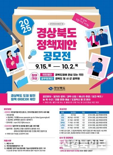 [ 신경북일보 ] 경상북도는 9월 15일부터 10월 2일까지 다양하고 창의적인 아이디어를 발굴해 도정 발전과 제도 개선에 반영하기 위해 ‘2025년 경상북도 정책 제안 공모전’을 개최한다.