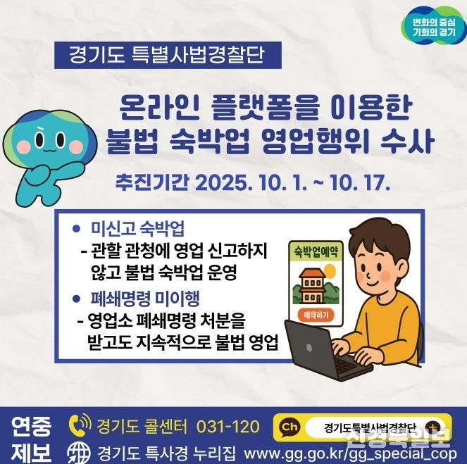 [ 신경북일보 ] 경기도가 10월 1일부터 17일까지 3주간 온라인 공유 숙박 플랫폼을 이용해 오피스텔 등에서 불법 숙박업을 운영하는 미신고 업소를 집중 단속한다.