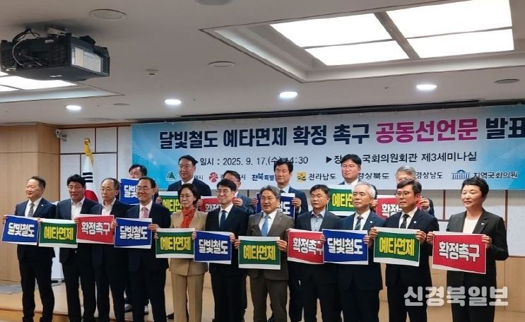 [ 신경북일보 ] 영․호남 6개 시․도지사와 달빛철도 경유지역 국회의원들이 17일 국회에서 ‘달빛철도 예비타당성조사 면제 확정을 촉구하는 공동선언’을 발표했다.