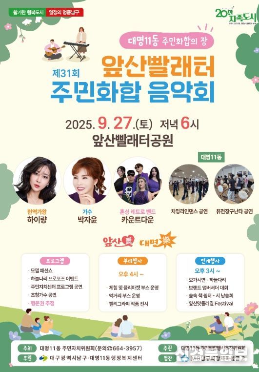 [ 신경북일보 ] 대구 남구 대명11동 행정복지센터는 주민과 함께하는 문화축제로 오는 9월 27일 오후 6시에 앞산빨래터공원에서 ‘제31회 앞산빨래터 주민화합 음악회’를 개최한다.
