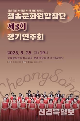 [ 신경북일보 ] 청송군은 오는 9월 25일 목요일 오후 7:00부터 청송문화예술회관 대공연장에서‘청송문화원합창단 제3회 정기연주회’를 개최한다고 밝혔다.
