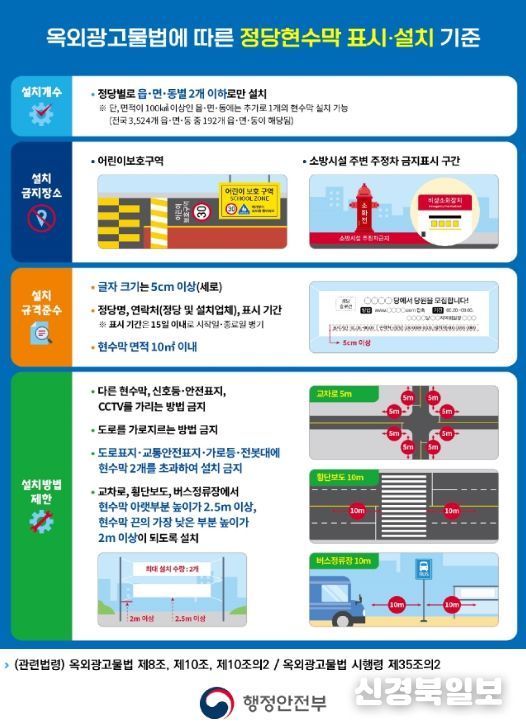 [ 신경북일보 ] 행정안전부는 9월 24일부터 10월 17일까지 3주간 불법광고물 설치 실태를 점검하고 법령 위반 현수막 일제 정비를 실시한다고 밝혔다.