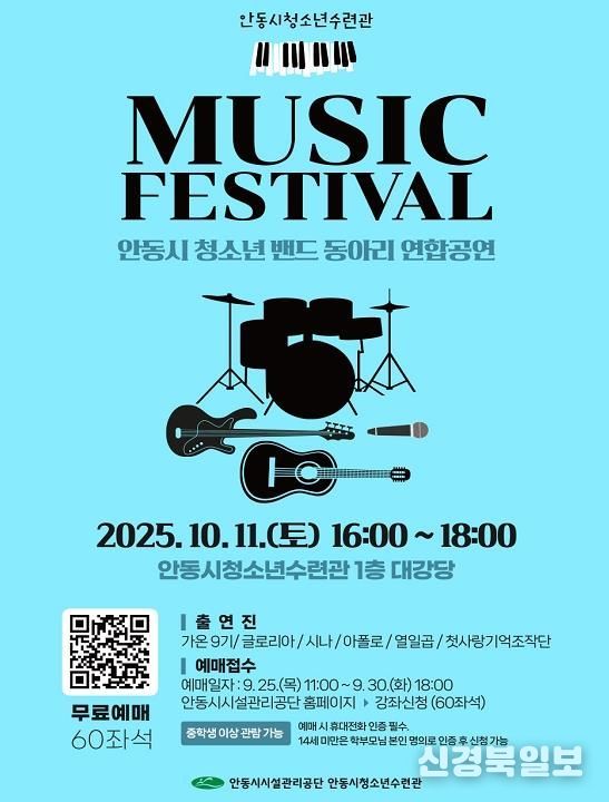 [ 신경북일보 ] 안동시시설관리공단에서 운영하는 안동시청소년수련관이 '2025 안동시 청소년 밴드 동아리 연합공연 ‘뮤직 페스티벌’'을 오는 10월 11일 청소년수련관 대강당에서 개최한다고 밝혔다.