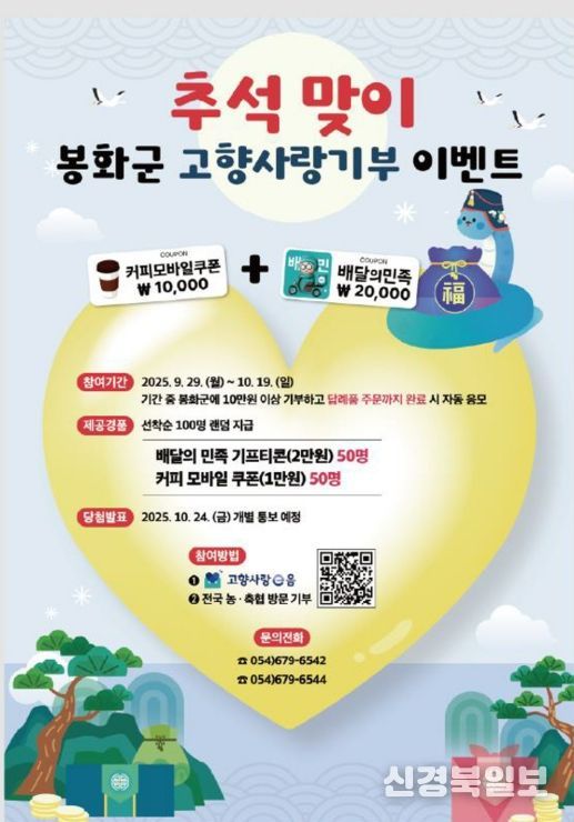 [ 신경북일보 ] 봉화군은 민족 최대의 명절인 추석을 맞아 고향사랑기부제에 대한 홍보와 기부문화 확산을 위해 오는 9월 29일부터 10월 19일까지 경품 이벤트를 실시한다.