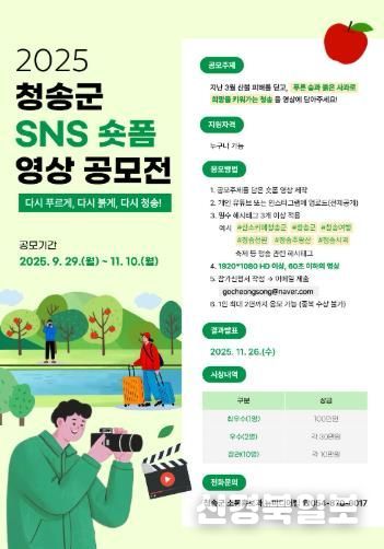 [ 신경북일보 ] 청송군은 산소카페 청송군의 대표 관광지와 축제를 널리 알리고 온라인 홍보를 활성화하기 위해 '2025 청송군 SNS 숏폼 영상 공모전'을 개최한다고 밝혔다.