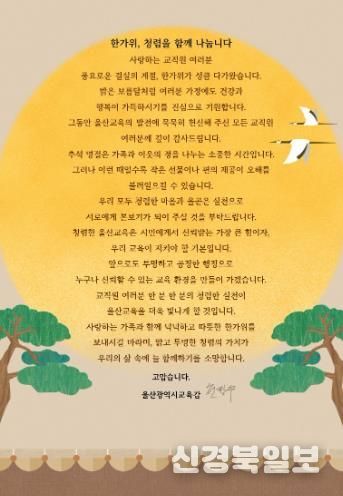 [ 신경북일보 ] 울산광역시교육청은 추석을 앞두고 1일 울산 지역 전 교육기관과 학교 교직원들에게 청렴 의지를 다지는‘청렴 서한문’을 보냈다.