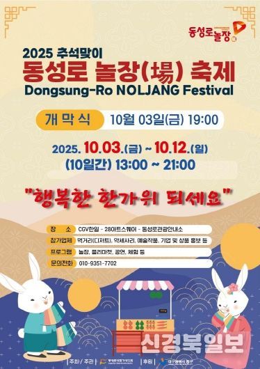 [ 신경북일보 ] 대구 중구는 10월 3일부터 12일까지 10일간 동성로 보행자전용도로 일원에서 ‘동성로에서 놀며 장보자!’라는 테마로 ‘2025 추석맞이 동성로 놀장(場) 축제’를 개최한다.