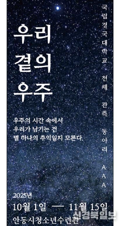 [ 신경북일보 ] 안동시시설관리공단이 운영하는 안동시청소년수련관은 10월 1일부터 11월 15일까지 청소년수련관 1층 꿈꾸는 미술관에서 '우리 곁의 우주展'을 개최한다고 밝혔다.