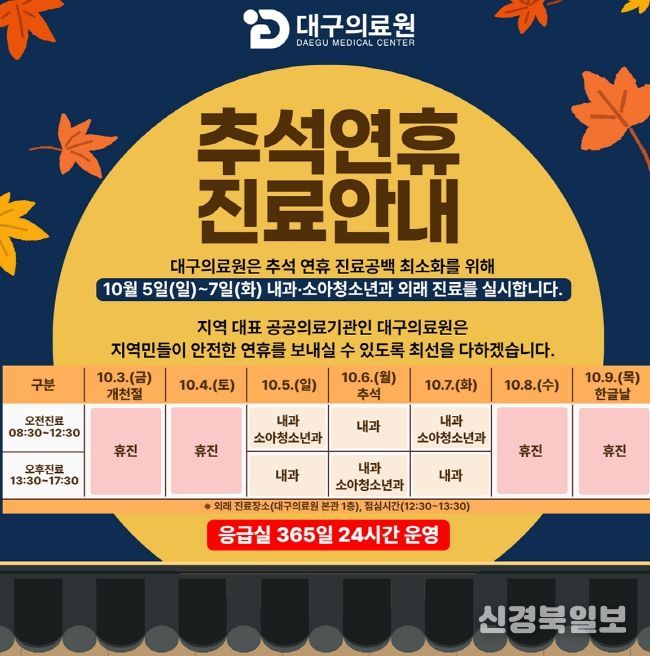 [ 신경북일보 ] 대구의료원이 추석 연휴 기간(10.3.~10.9.) 응급실 운영을 강화하고, 10월 5일(일)부터 7일(화)까지 내과·소아청소년과 외래 진료를 실시한다.