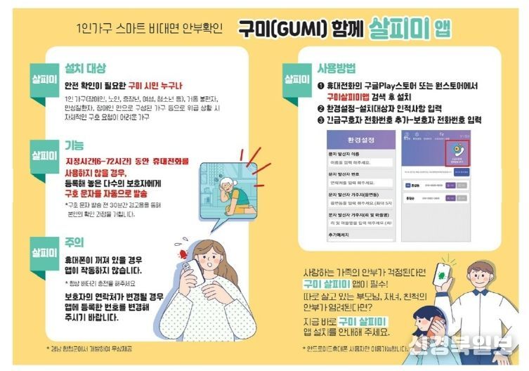 [ 신경북일보 ] 구미시는 긴 추석 연휴를 맞아 시민과 방문객이 함께 참여하는 안전망 강화 홍보에 나선다. 특히, 1인 가구, 독거노인 등 돌봄이 필요한 가족과 이웃 등의 안전을 확인할 수 있는 '구미함께 살피미 앱'을 적극 홍보하며 따뜻하고 안전한 명절 만들기에 힘쓸 계획이다.
