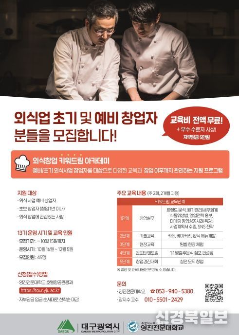 [ 신경북일보 ] 대구광역시는 외식업 예비창업자와 초기 창업자의 안정적 정착을 지원하기 위해 외식창업 ‘키워드림’ 아카데미 13기 참가자를 10월 15일까지 모집한다.