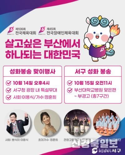 [ 신경북일보 ] 부산 서구는 오는 10월 14일 16시, 제106회 전국체육대회와 제45회 전국장애인체육대회의 시작을 알리는 “성화의 불꽃, 하나되는 서구”를 주제로 성화봉송 맞이행사를 서구청 광장 특설무대에서 개최한다고 밝혔다.