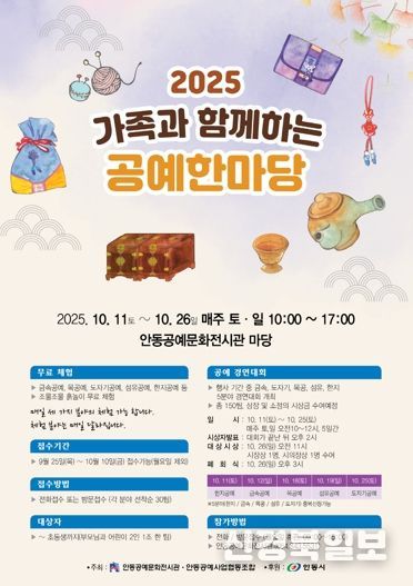 안동시 관계자는 “이번 ‘2025 가족과 함께하는 공예한마당’ 행사는 시민이 일상 속에서 공예의 아름다움과 가치를 직접 느낄 수 있는 소중한 기회”라며 “특히 어린이들이 가족과 함께 다양한 공예 분야에 참여하며 창의력과 손재주를 키울 수 있는 뜻깊은 시간이 되길 바란다”고 전했다.