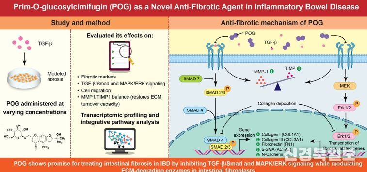 연구진들은 장 섬유화(Intestinal fibrosis) 진행을 억제하는 새로운 치료전략이자 천연물 유래 성분 ‘Prim-O-glucosylcimifugin(POG)’의 기능을 밝혀냈다.