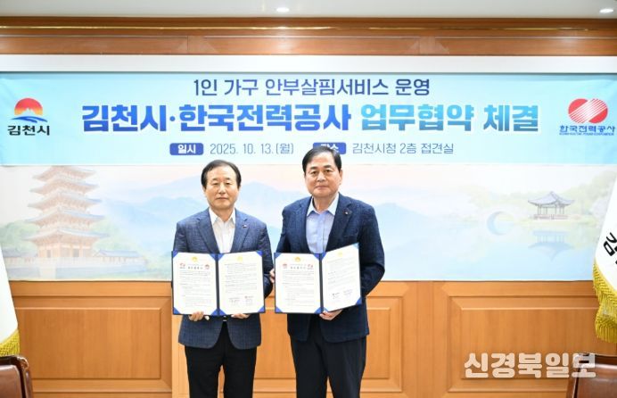 [ 신경북일보 ] 김천시는 지난 13일 한국전력공사 대구본부 김천지사(지사장 박용성)와 함께 ‘1인 가구 안부살핌서비스 '든든e살핌'’ 업무협약을 체결했다.