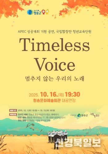 [ 신경북일보 ] 청송군은 오는 16일 저녁 7시 30분, 청송문화예술회관 대공연장에서 APEC 성공개최를 기원하는 국립합창단 청년교육단원 공연 ‘Timeless Voice – 멈추지 않는 우리의 노래’를 개최한다.