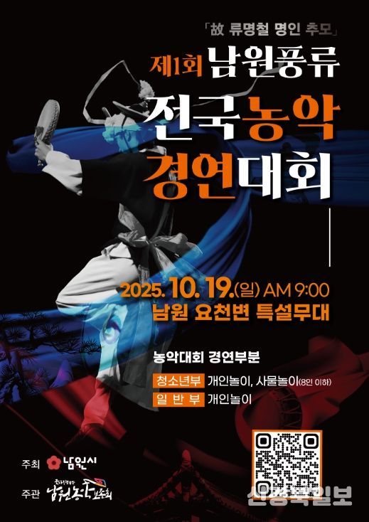 [ 신경북일보 ] 고(故) 류명철 명인을 추모하고 남원농악의 전통을 전국적으로 확산하기 위한 ‘제1회 남원풍류 전국농악경연대회’가 오는 10월 19일, 남원시 요천변 특설무대에서 열린다.