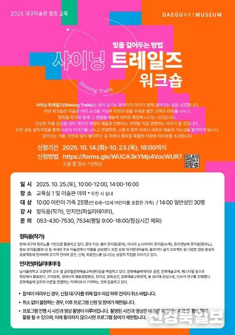[ 신경북일보 ] 대구문화예술진흥원 대구미술관은 오는 10월 25일, 오전 10시, 오후 2시, 총 2회에 걸쳐 열린 교육 ‘샤이닝 트레일즈 워크숍: 빛을 걸어 두는 방법’을 운영한다.