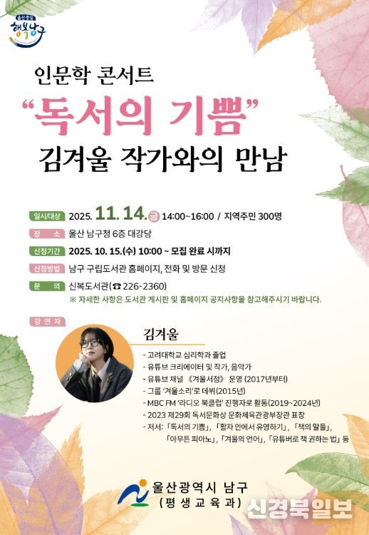 [ 신경북일보 ] 울산 남구 구립도서관은 인문학 콘서트‘김겨울 작가와의 만남’ 수강생을 모집한다.