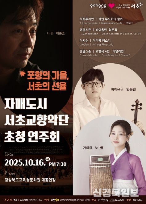[ 신경북일보 ] 포항시는 오는 16일 경상북도교육청문화원 대공연장에서 자매도시인 서초교향악단을 초청해 ‘포항의 가을, 서초의 선율’ 교향악 공연을 연다고 밝혔다.