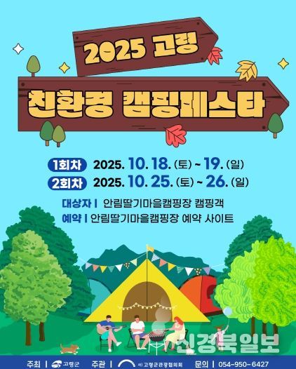 [ 신경북일보 ] 지역과 미래를 배려하는 친환경 캠핑 문화 확산을 위해 마련된 ‘2025 고령 캠핑 페스타’가 오는 10월 18일부터 19일, 10월 25일부터 26일 두 차례에 걸쳐 안림딸기마을캠핑장에서 열린다.