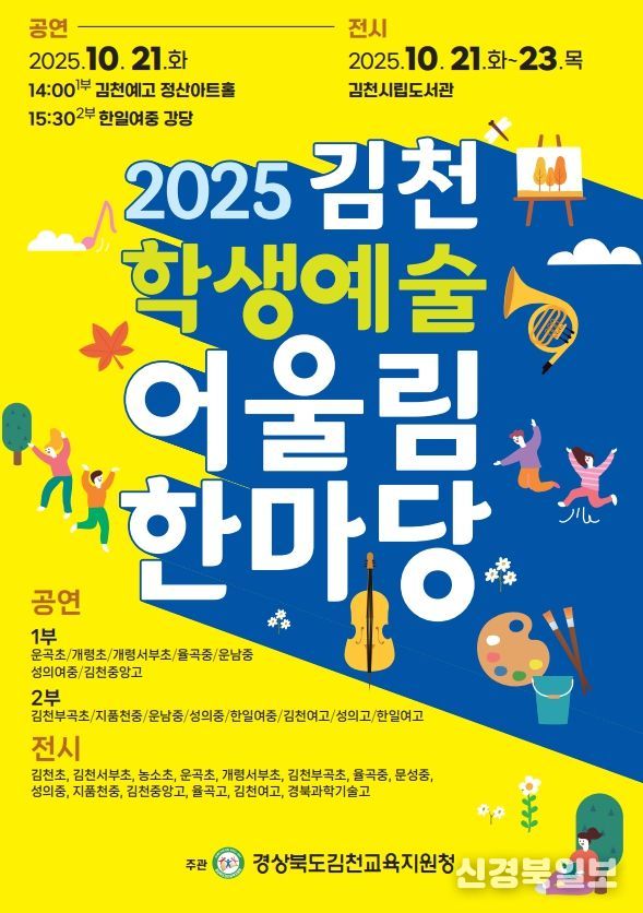 [ 신경북일보 ] 경상북도김천교육지원청은 오는 10월 21일 김천예술고등학교와 한일여자중학교에서 공연 행사를 열고, 김천시립도서관에서 전시 행사(21일-23일)를 통해 ‘2025 김천학생예술어울림한마당’을 개최한다.