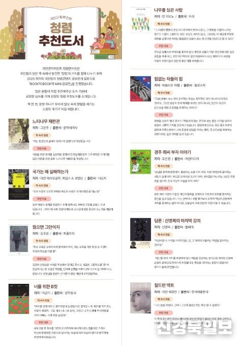 청렴연수원장은 “이번 추천 도서는 국민이 직접 추천한 도서 중 청렴의 가치를 이야기하는 책을 선정했다는 점에서 의미가 있다.”라며, “앞으로 많은 분이 일상 속에서 독서를 통해 청렴을 생각하고 실천하는 계기가 되기를 바란다.”라고 말했다.