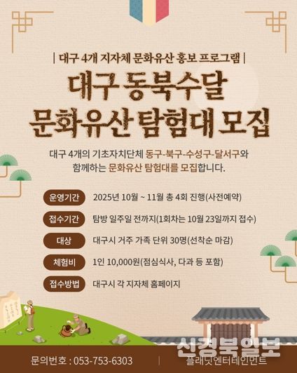 [ 신경북일보 ] 대구 수성구, 동구, 북구, 달서구가 협력해 지역의 역사와 문화를 함께 배우고 체험하는 ‘대구 문화유산 탐험대’ 운영을 시작한다.