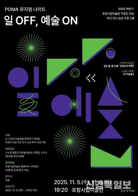 [ 신경북일보 ] 포항시립미술관은 오는 11월 5일부터 6일까지 양일간 직장인을 대상으로 한 야간 전시 감상 프로그램 ‘POMA 뮤지엄 나이트: 일 OFF, 예술 ON’을 운영한다.