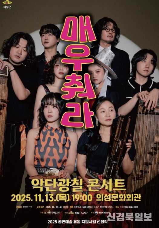 [ 신경북일보 ] 의성군은 한국을 넘어 세계 무대에서 한국 전통 국악을 알리고 있는 악단광칠의 '매우 춰라!' 공연을 11월 13일 오후 7시, 의성문화회관에서 개최한다고 밝혔다.