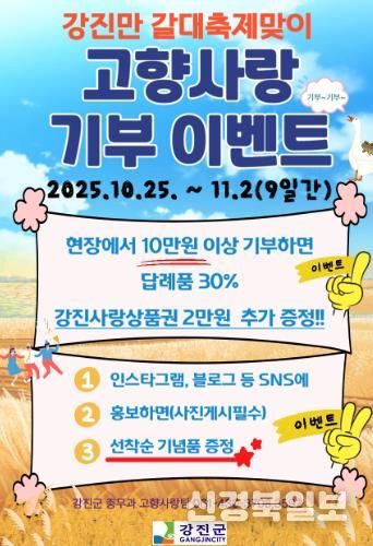 [ 신경북일보 ] 강진군이 오는 25일부터 11월 2일까지 제10회 강진만 춤추는 갈대축제가 열리는 강진만생태공원 전용부스에서 강진 고향사랑기부제 이벤트를 진행한다.