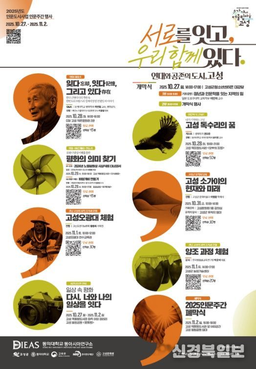 [ 신경북일보 ] 고성군은 동의대학교와 협력하여 수행하는 사업인 ‘2025년도 인문도시사업 인문주간 행사’를 10월 27일 청소년센터 온에서 개막식을 시작으로 11월 2일까지 7일간 개최한다.