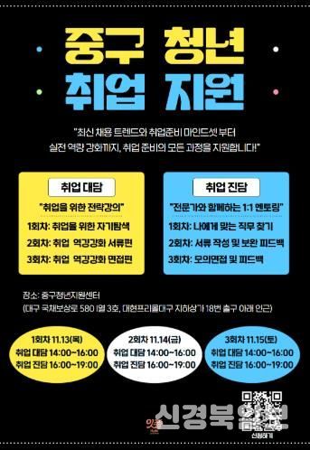 [ 신경북일보 ] 대구 중구청년지원센터는 11월 13일부터 15일까지 중구청년지원센터 ‘잇플’에서 ‘중구 청년 취업지원 프로그램’을 개최한다.