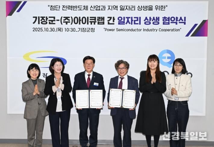 [ 신경북일보 ] 기장군은 30일 전력반도체 분야 첨단 기술기업인 ㈜아이큐랩과 ‘지역 일자리 상생 협약’을 체결하고, 지역 일자리 창출에 박차를 가한다고 밝혔다.
