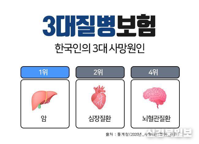 [ 신경북일보 ] 흔히 3대질병이라 일컫는 암, 심혈관질환, 뇌혈관질환은 통계청 발표자료에 따르면 한국인의 주요 사망원인 중에서 3위 폐렴을 제외하고 1~4위를 차지하고 있으며, 이전부터 지금까지도 살면서 가장 먼저 대비해야 하는 치명적인 질병으로 강조되고 있다. 이러한 중대질병에 대비하기 위하여 상기 세가지 치명적인 질병을 집중보장하는 3대질병진단비보험을 많이 가입하고 있다. 3대진단비보험은 각각의 질병을 중점적으로 보장하면서도 가입자 특성에 맞는 특약을 추가함으로써 종합건강보험으로도 활용할 수가 있다.