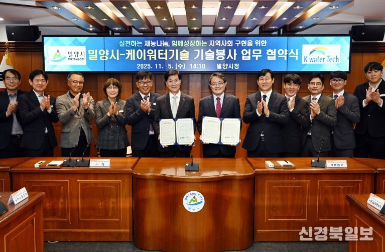[ 신경북일보 ] 경남 밀양시와 케이워터기술(주)(대표 정승용)은 5일 시청 소회의실에서 ‘실천하는 재능나눔, 함께 성장하는 지역사회 구현을 위한 기술봉사 업무협약’을 체결했다고 밝혔다.