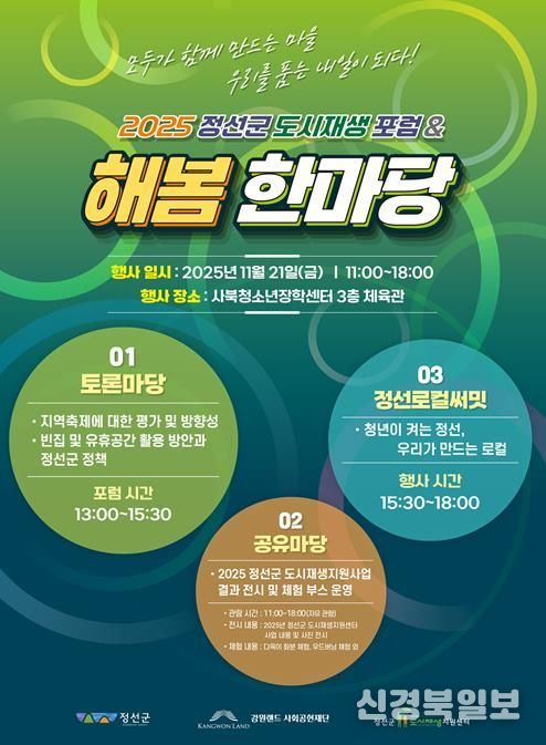 [ 신경북일보 ] 정선군도시재생지원센터는 오는 2025년 11월 21일 사북청소년장학센터에서 '2025 도시재생포럼 및 해봄한마당'를 개최한다고 밝혔다.