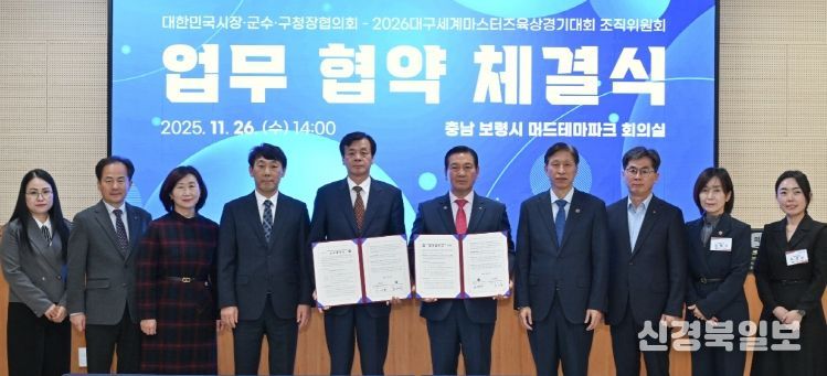 [ 신경북일보 ] 2026대구세계마스터즈육상경기대회 조직위원회는 대한민국시장·군수·구청장협의회와 11월 26일 충남 보령시 머드테마파크 컨벤션홀에서 성공적인 대회 개최를 위한 업무협약을 체결하고, 공동회장단 회의에 참여해 대회 홍보와 선수 모집 지원 등을 요청했다.
