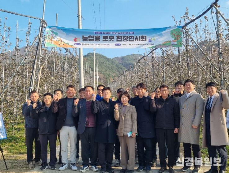 [ 신경북일보 ] 포항시는 26일 죽장면 상옥리 사과원에서 농촌진흥청, 한국농업기술진흥원, 경상북도, 지역 농업인 등 관계자 70여 명이 참석한 가운데 방제·운반·모니터링 로봇을 활용한 과수(사과)분야 현장 연시회를 개최했다.