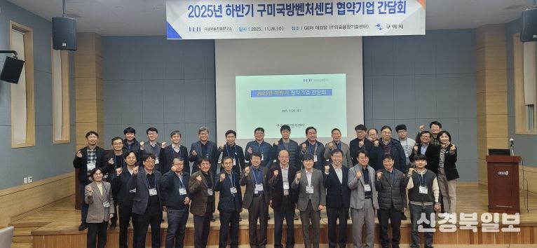 [ 신경북일보 ] 구미시는 11월 26일 금오테크노밸리 IT의료융합기술센터 대강당에서 '2025년 구미국방벤처센터 협약기업 간담회'를 열고 지역 방산기업의 성장 전략을 논의했다. 간담회에는 정성현 구미시 부시장과 구미국방벤처센터 협약기업 31개사를 포함해 50여 명이 참석했다.