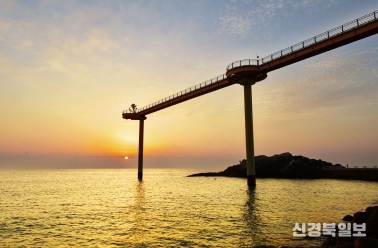 비단결 후포 바다를 가르며 존재감을 뿜어내는 후포 등기산 스카이 워크.그리고 비단결 후포 바다 위에 내린 새벽 첫 빛이 장관을 연출한다.